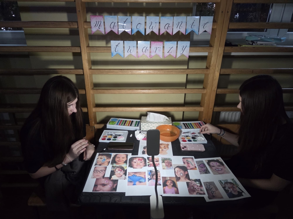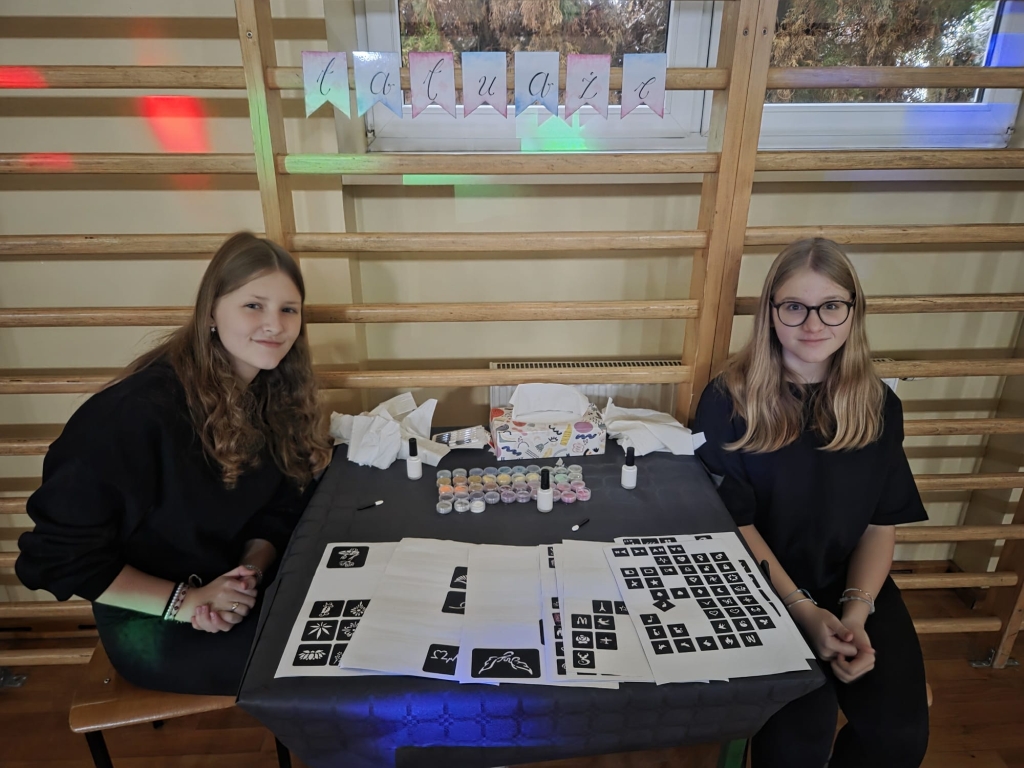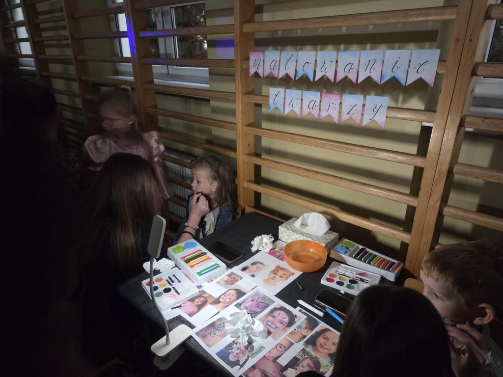 Najmłodsi uczniowie mieli okazję przenieść się do świata andrzejkowych tradycji dzięki przygotowanym wróżbom. Każdy mógł sprawdzić, co przyniesie przyszłość – od zawodów marzeń po imiona przyszłych przyjaciół. Wróżby dostarczyły dzieciom wielu emocji i wywołały mnóstwo uśmiechów. Dużą atrakcją okazały się tatuaże brokatowe oraz malowanie twarzy. Dzieci z dumą prezentowały kolorowe wzory i błyszczące ozdoby, które dodawały całej zabawie niezwykłego, magicznego charakteru. Nie zabrakło również zabaw tanecznych, podczas których mali uczestnicy mogli zaprezentować swoje taneczne talenty. Wspólne tańce, konkursy ruchowe i muzyka stworzyły wspaniałą atmosferę, a sala balowa tętniła energią od pierwszych do ostatnich minut wydarzenia.