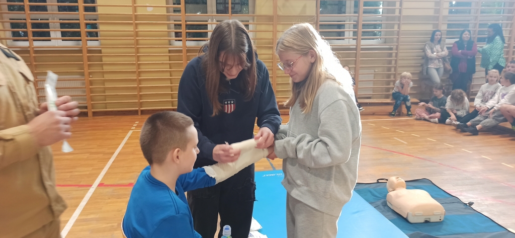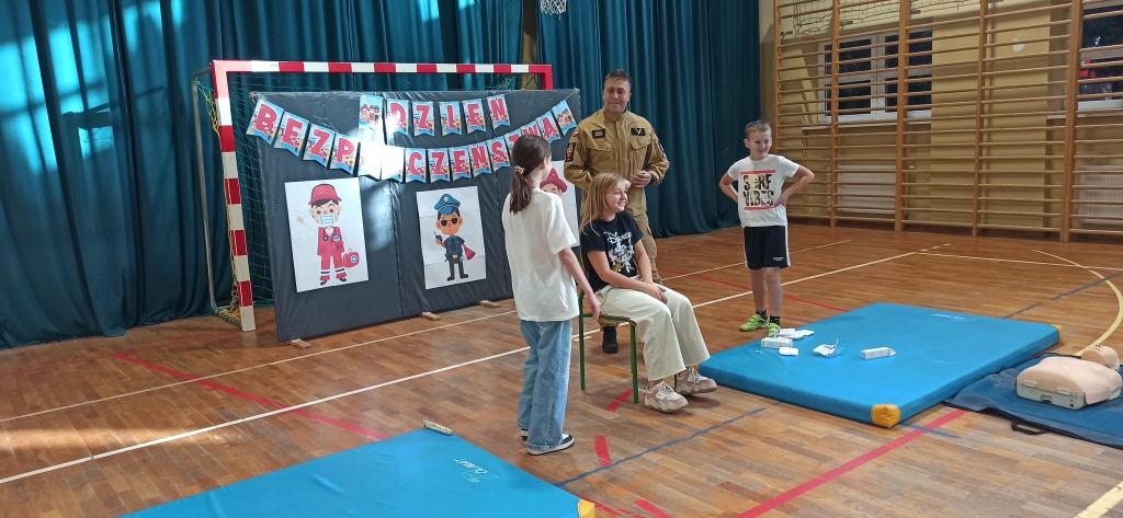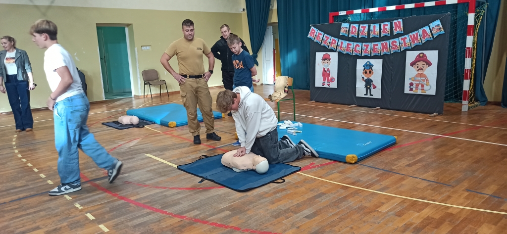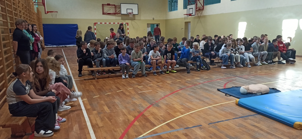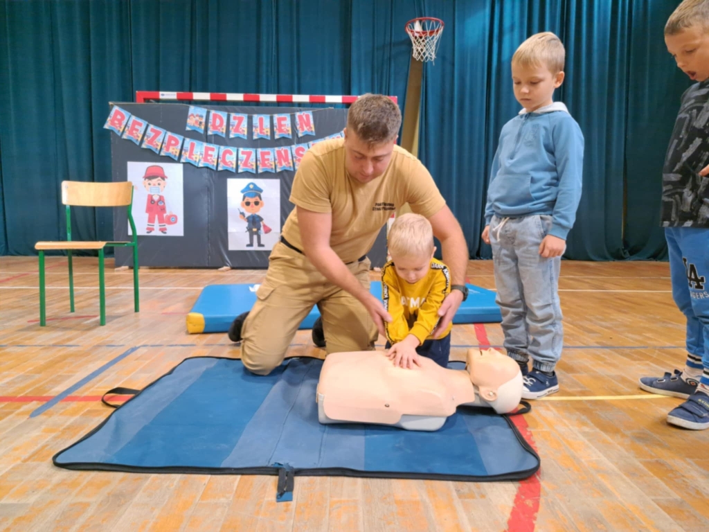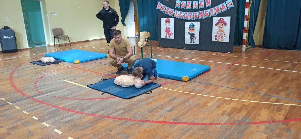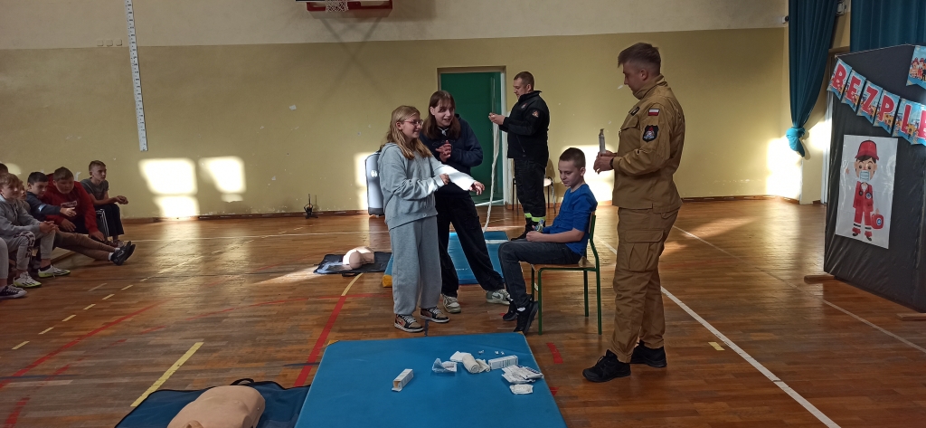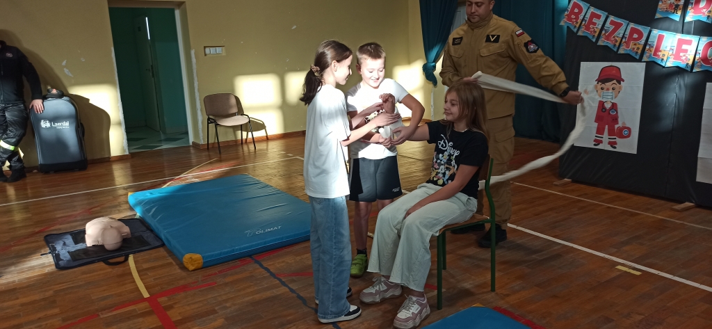 Drudzy z zaproszonych gości – Strażacy JRG z Ozorkowa przeprowadzili pogadankę popartą pokazem resuscytacji krążeniowo – oddechowej. Uczniowie mogli samodzielnie poćwiczyć pod okiem ekspertów jak ratować ludzkie życie w przypadku zagrożenia. Chętni uczniowie mogli samodzielnie założyć opatrunek i poznać całe procedury z tym związane. Omówione zostały również tematy związane z numerami alarmowymi oraz zagrożeniami mogącymi wystąpić w trakcie sezonu grzewczego. Dużą atrakcją dla dzieci był pokaz wozu strażackiego, jego wyposażenia oraz omówienie zastosowania najważniejszych elementów używanych podczas pożarów.