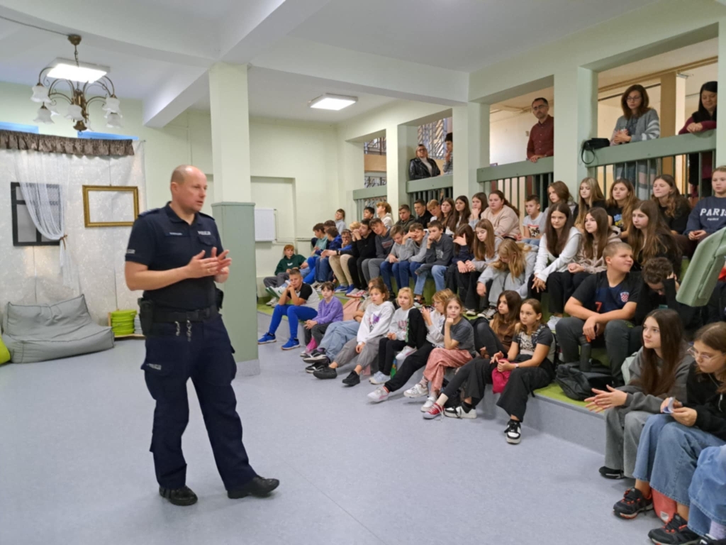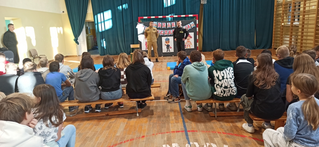 o konieczności używania elementów odblaskowych, które niejednokrotnie mogą uratować ludzkie życie. Podkreślił znaczenie różnych znaków drogowych. Zwrócił szczególną uwagę na właściwe zachowanie się podczas przechodzenia przez przejście dla pieszych. Omówił również zasady bezpieczeństwa podczas Dnia Wszystkich Świętych. Przestrzegał uczniów przed osobami nieznanymi i sytuacjami, które mogą się zdarzyć. Przypomniał także o korzystaniu z numeru alarmowego 112 w uzasadnionych przypadkach oraz o informacjach, które należy przekazać dyspozytorowi o zaistniałym zdarzeniu.