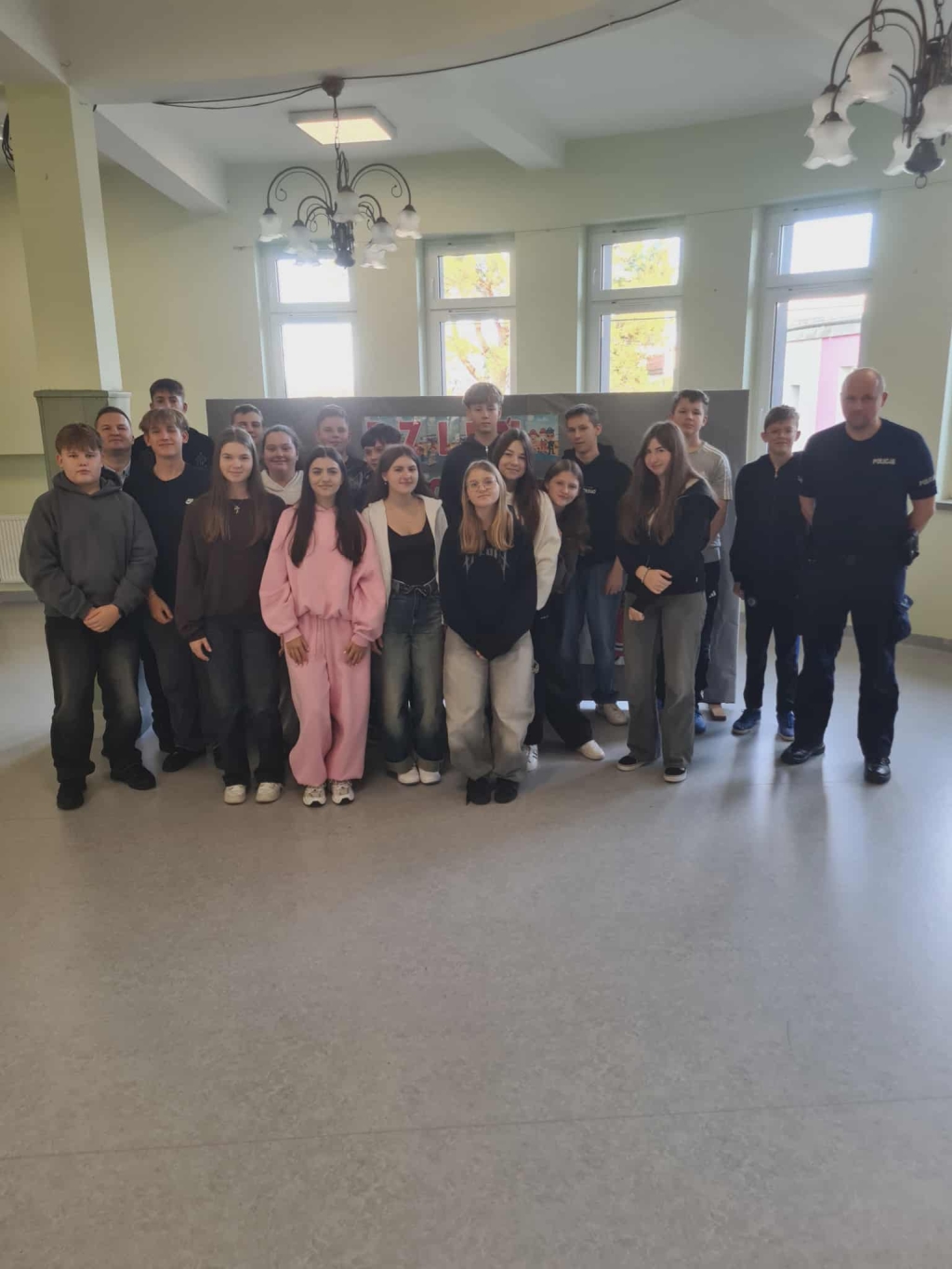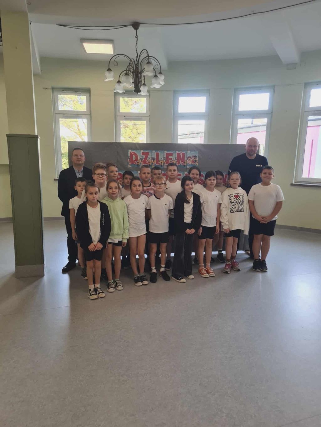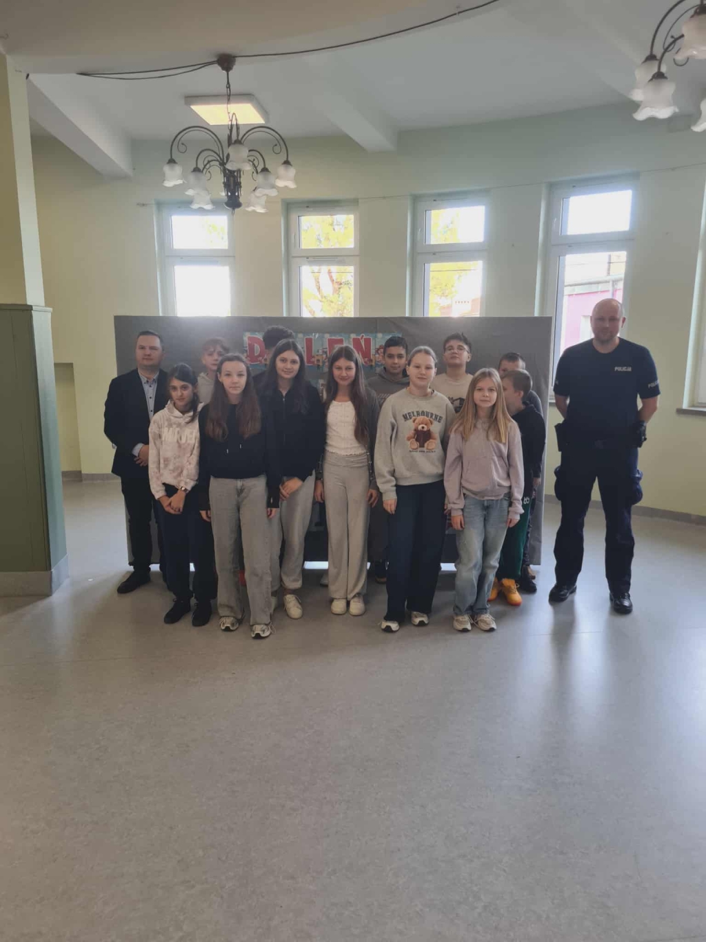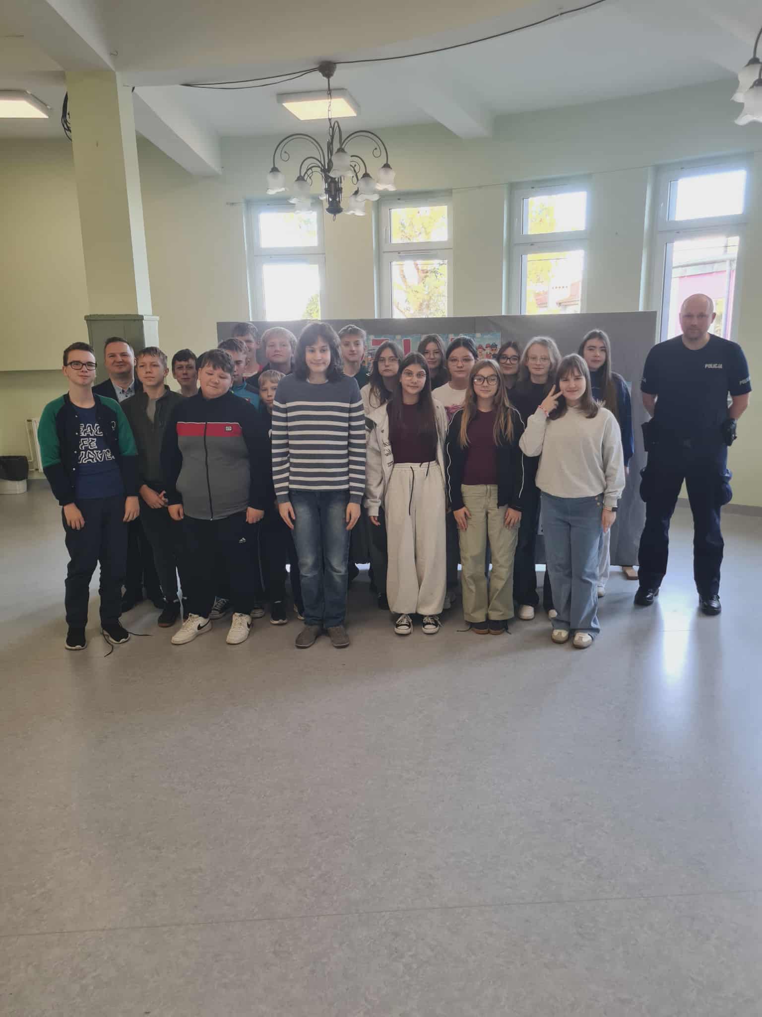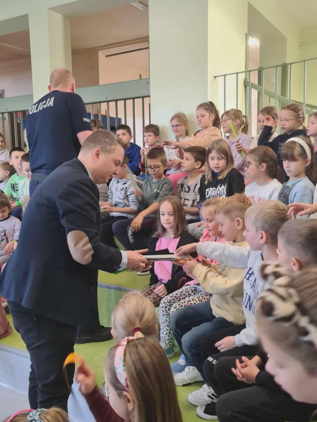 I-III oraz klasy IV – VIII. W trakcie prelekcji przypomniano uczniom zasady ruchu drogowego, ze zwróceniem szczególnej uwagi na prawidłowe korzystanie z hulajnogi elektrycznej oraz rowerów. Dużo uwagi poświęcono również na prawidłowe przechodzenie przez jezdnię – zwłaszcza podczas dowozów szkolnych oraz używania telefonów komórkowych w trakcie przechodzenia przez pasy. Nie zabrakło również informacji na temat elementów odblaskowych, których noszenie na co dzień może uratować życie. W młodszych grupach przypomniany został dzieciom numer telefonu alarmowego. Ponadto uczniowie podczas spotkania z Policją dowiedzieli się, jakie negatywne skutki niesie niewłaściwe korzystanie