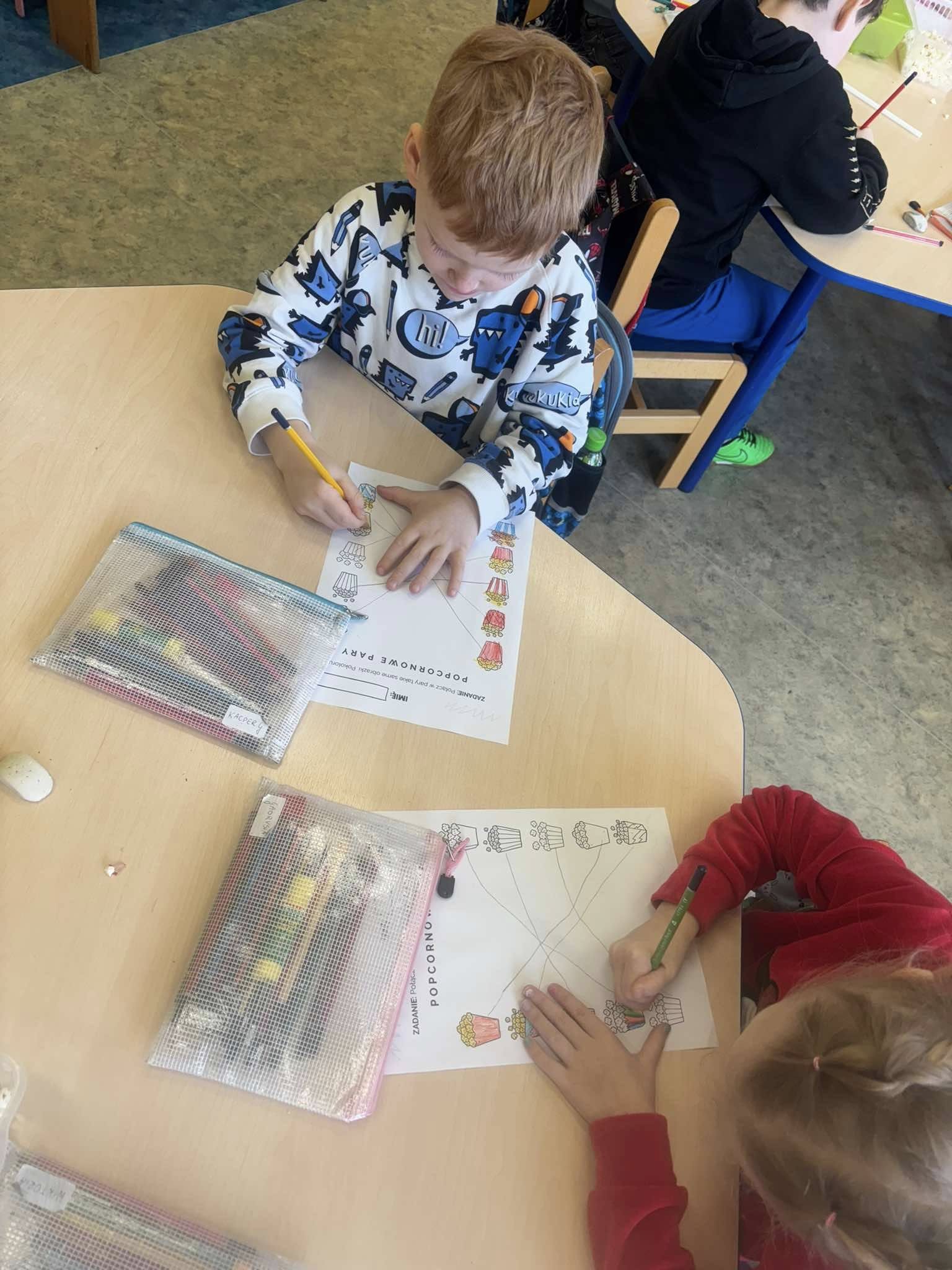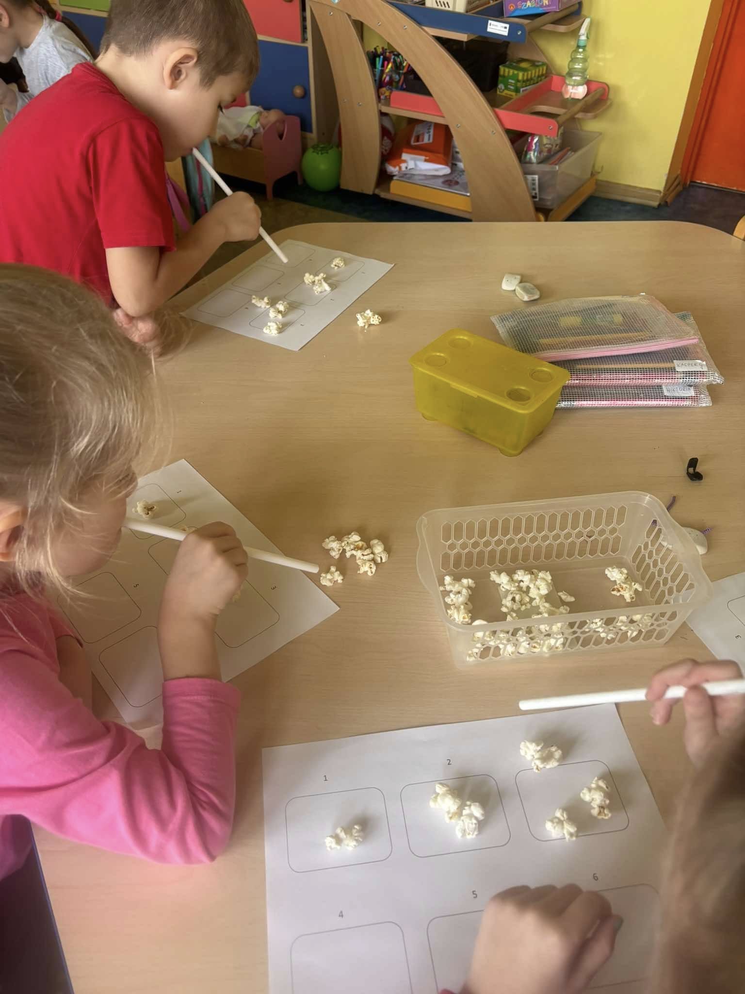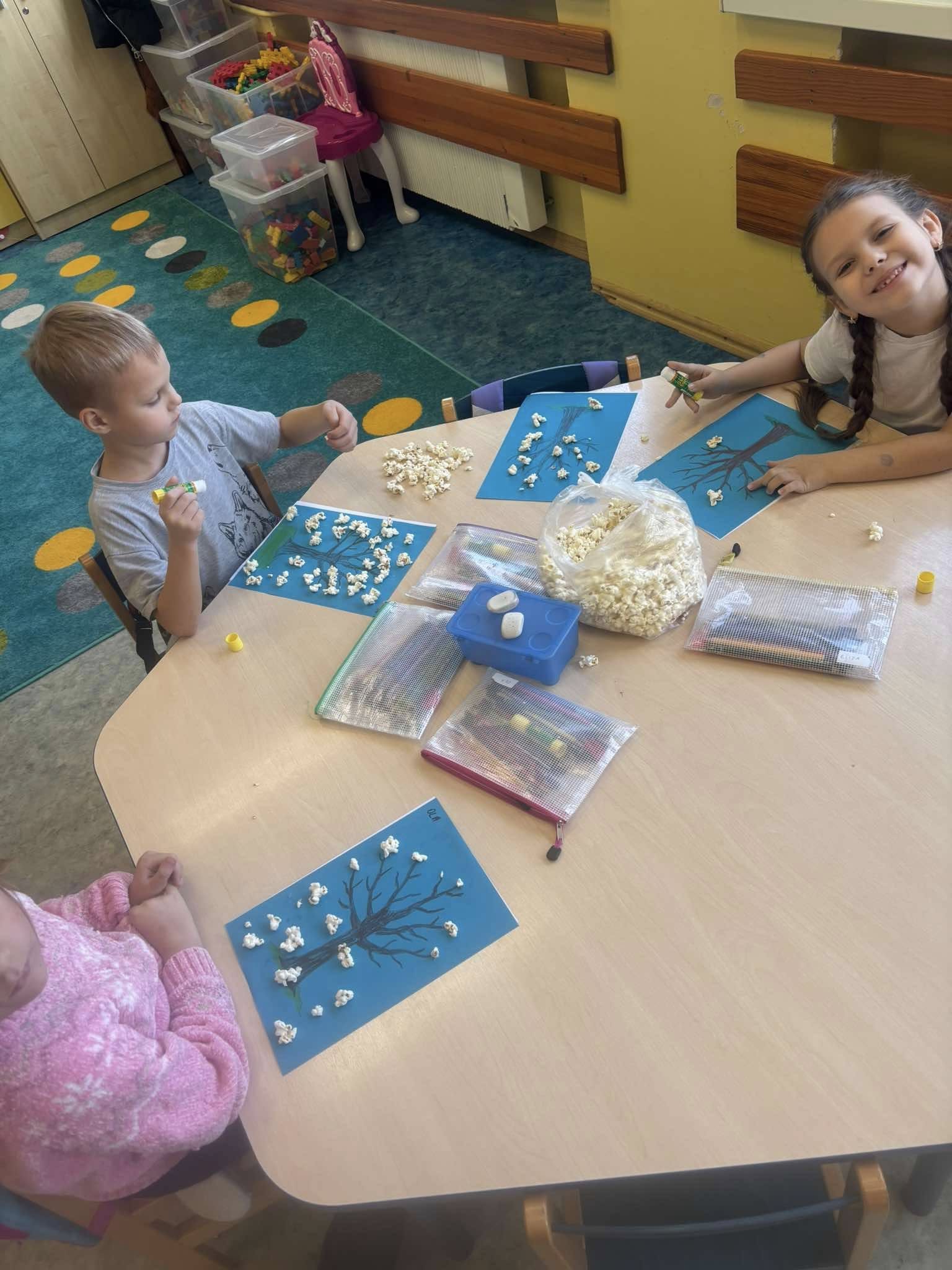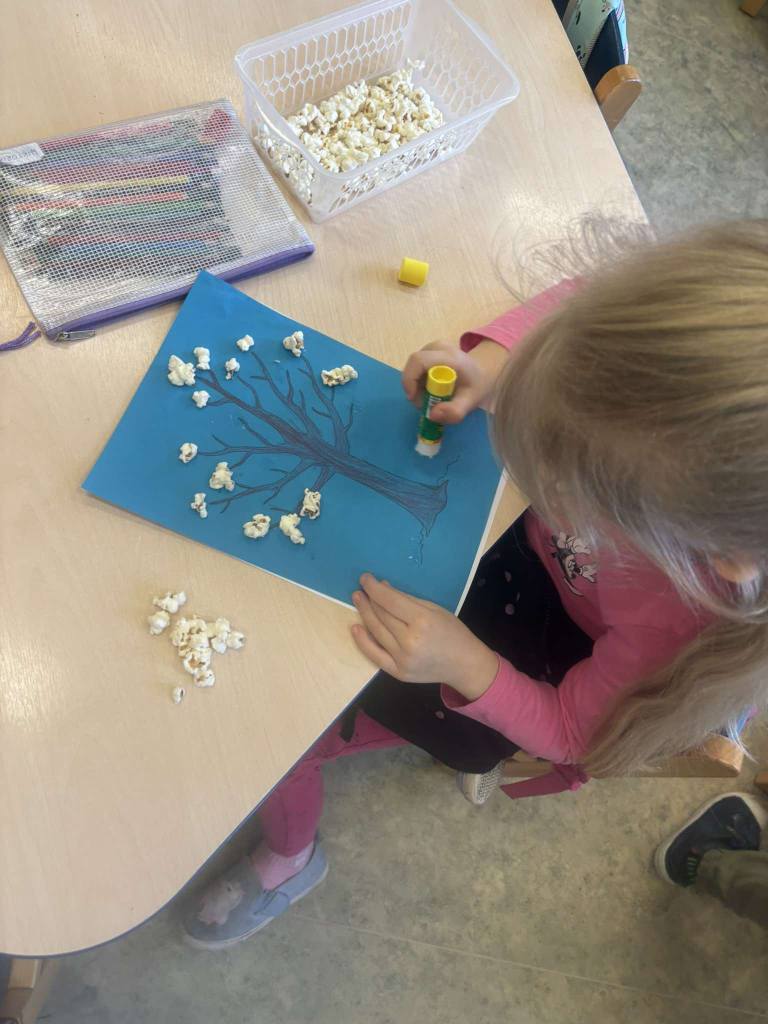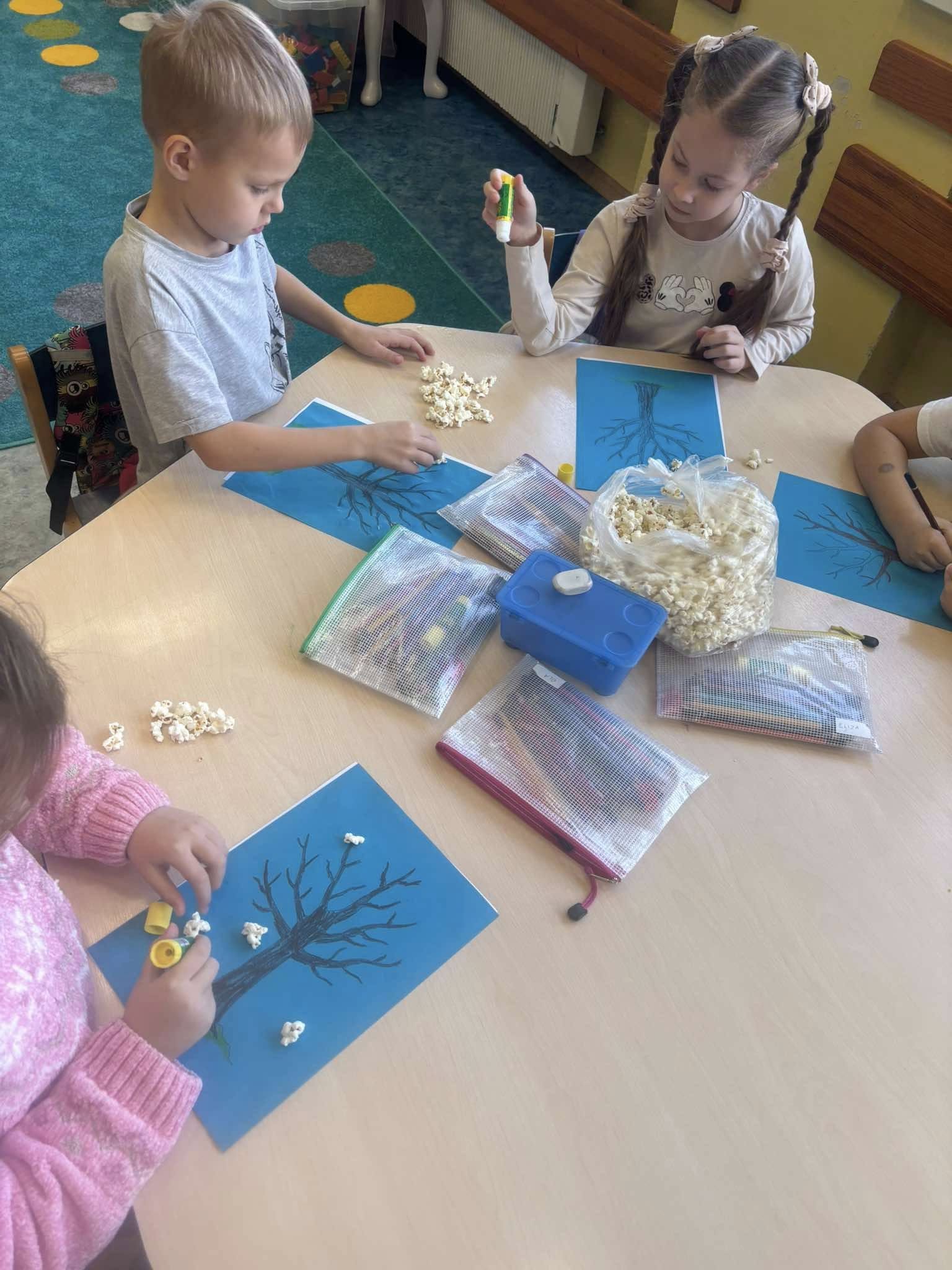 Uczniowie klasy 0a podczas zajęć dowiedzieli się z czego i jak powstaje popcorn. Przy okazji wykonali kilka ćwiczeń oddechowych z użyciem popcornu oraz wykonały karty pracy. Na koniec powstały piękne zimowe drzewka z wykorzystaniem popcornu.
