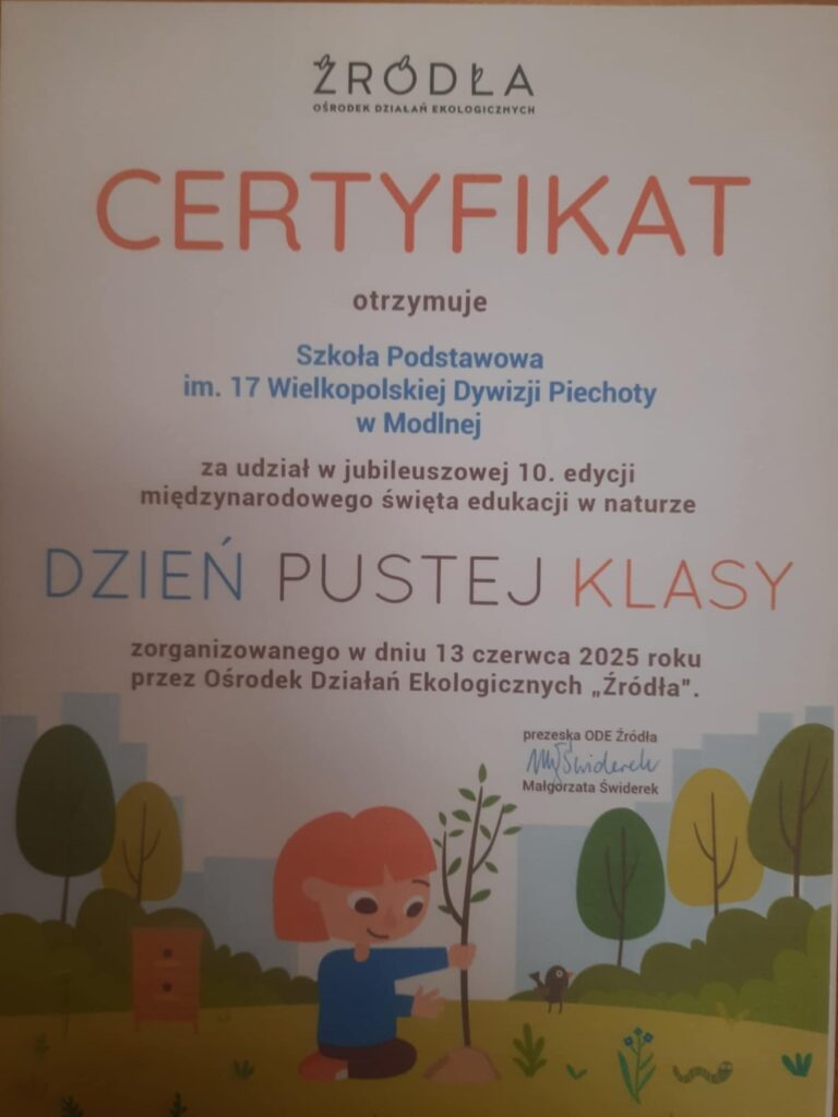 Szkoła Podstawowa im. 17 Wielkopolskiej Dywizji Piechoty w Modlnej po raz kolejny włączyła się w ogólnopolską akcję #Dzień Pustej Klasy, obchodzoną w tym roku 13 czerwca. Dzień Pustej Klasy jest wyjątkową, międzynarodową inicjatywą promującą wartość edukacji na świeżym powietrzu. To święto zainaugurowane w 2012 roku przez grupę londyńskich nauczycieli miało jeden prosty cel: sprawić, aby tego dnia klasy opustoszały. W 2016 roku w Polsce Ośrodek Działań Ekologicznych „Źródła” jako pierwszy zaproponował obchodzenie tego święta także w Polsce. Ich propozycja spotkała się wówczas z niezwykle pozytywną reakcją ze strony szkół w całym kraju, a akcja jest kontynuowana do dnia dzisiejszego.