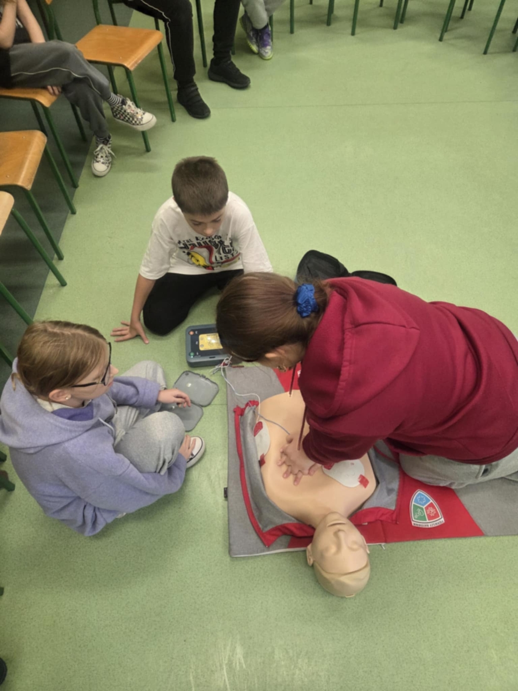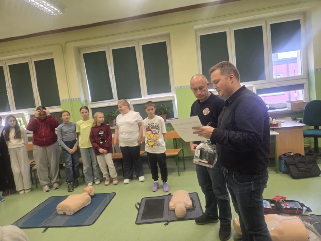 W ramach obchodów Europejskiego Dnia Przywracania Czynności Serca 29 października 2025 r. gościliśmy w naszej szkole pana Artura Białkowskiego, strażaka i ratownika medycznego promującego Program „Pierwszy Ratownik”. Jest to innowacyjna inicjatywa mającą na celu zwiększenie bezpieczeństwa i gotowości do reagowania w sytuacjach nagłego zagrożenia życia. Program jest częścią globalnej idei First Responder, która już przynosi znaczące rezultaty w wielu krajach świata. W naszym kraju inicjatywie patronuje Związek Ochotniczych Straży Pożarnych Rzeczypospolitej Polskiej. Uczniowie klas V, VI oraz VIII podczas specjalnie przygotowanych zajęć poznawali zasady udzielania pierwszej pomocy przedmedycznej — uczyli się, jak reagować w sytuacjach zagrożenia życia, jak ułożyć poszkodowanego w pozycji bocznej bezpiecznej oraz jak ważna jest resuscytacja krążeniowo-oddechowa (RKO) i użycie AED. Zajęcia nie były tylko suchą teorią. Uczniowie ćwiczyli w trójkach, odgrywali scenki symulujące wypadek działając jak prawdziwi ratownicy. Dziękujemy serdecznie Panu Arturowi Białkowskiemu za poświęcony naszym uczniom czas i przekazanie ogromu wiedzy, która może uratować życie każdemu z nas!