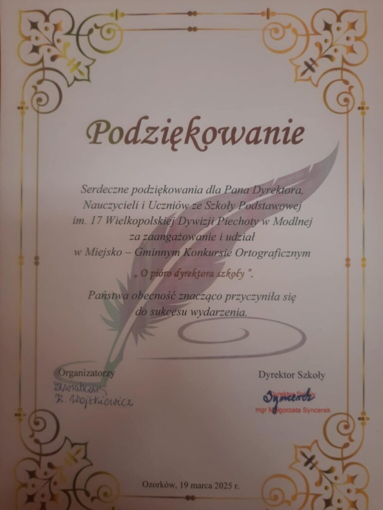 We wtorek 19 marca 2025 roku uczennice klasy VII Magdalena Browarska, Maria Jagodzińska oraz Maja Derlecka reprezentowały naszą szkołę w miejsko-gminnym konkursie ortograficznym “O pióro dyrektora szkoły” zorganizowanym przez Szkołę Podstawową nr 2 w Ozorkowie pod patronatem Burmistrza Miasta. Dziewczyny przez regulaminowe 60 minut mierzyły się z różnymi ortograficznymi pułapkami. Chociaż w tym roku nie udało im się zająć miejsc czołowych miejsc liczymy, że zdobyta wiedza z pewnością zaowocuje w przyszłości.