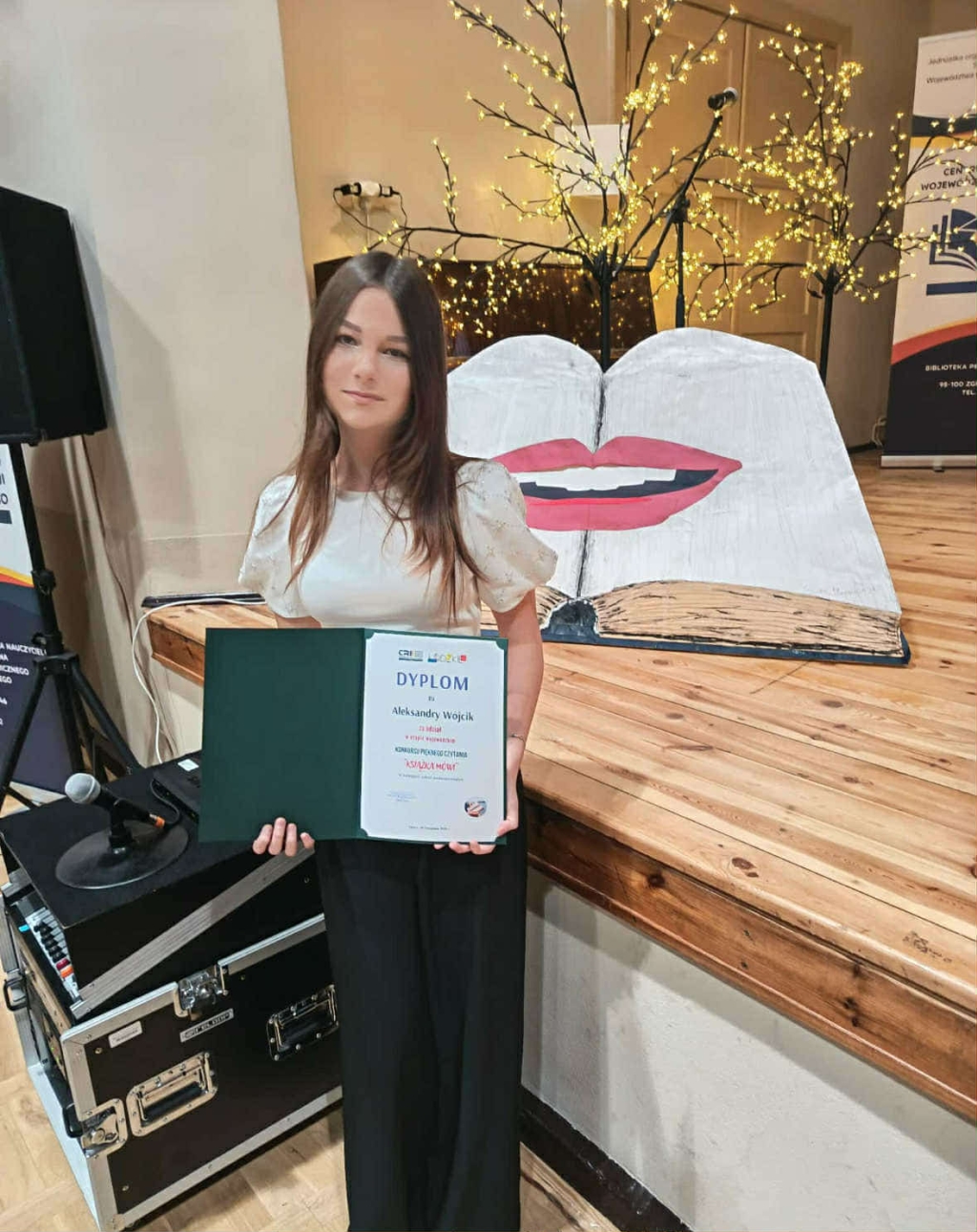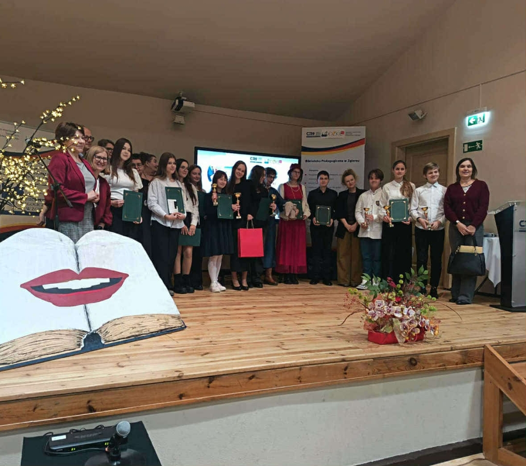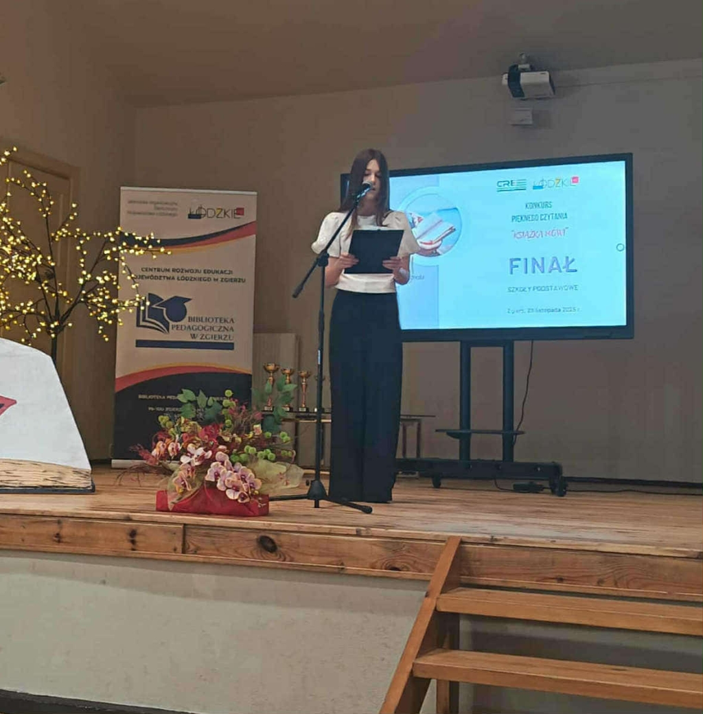 Nasza uczennica Aleksandra Wójcik wzięła udział w finale etapu wojewódzkiego Konkursu Pięknego Czytania „Książka mówi”. Tegoroczna edycja przedsięwzięcia miała na celu promowanie czytelnictwa oraz nawiązywała do patronów roku 2025: Marii Pawlikowskiej-Jasnorzewskiej, ks. prof. Józefa Tischnera, Władysława Stanisława Reymonta, Stefana Żeromskiego i Antoniego Słonimskiego. Ola zaprezentowała komisji dwa teksty: przygotowany wcześniej fragment „Ziemi obiecanej” Władysława Reymonta oraz wylosowany w trakcie konkursu wiersz Marii Pawlikowskiej-Jasnorzewskiej pt. „Szarotka”. Nasza uczennica poradziła sobie wspaniale – jesteśmy ogromnie dumni z jej osiągnięcia! Dodatkowo nasza szkoła otrzymała nagrodę w postaci pakietu książek do biblioteki. Bardzo cieszymy się z przyznanego wyróżnienia i z niecierpliwością czekamy na nowe pozycje, które wzbogacą księgozbiór.