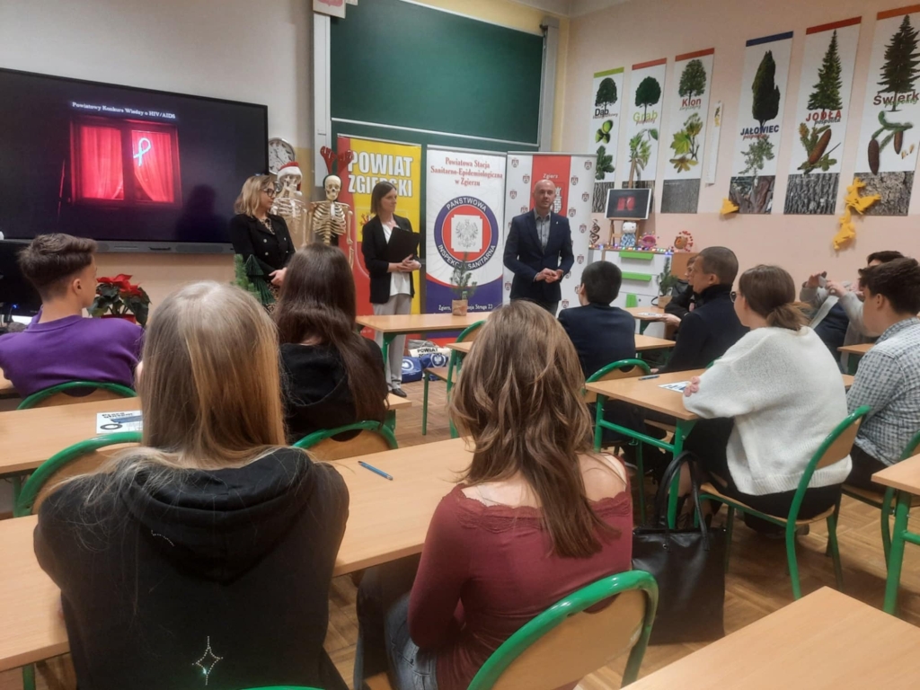 10 grudnia 2024. r uczennice klasy VIII Maria Wiktorowska, Maja Masztakowska oraz Zuzanna Karolak uczestniczyły w „Powiatowym Konkursie Wiedzy o AIDS 2024” zorganizowanym pod patronatem Prezydenta Miasta Zgierza i Starosty Zgierskiego przez Samorządowe Liceum Ogólnokształcące im. Romualda Traugutta w Zgierzu oraz Powiatową Stację Sanitarno- Epidemiologiczną. Konkurs promował zdrowy styl życia w zakresie przeciwdziałania zakażeniom HIV oraz propagował rzetelne i aktualne informacji w zakresie tej problematyki. Chociaż naszym uczennicom nie udało się zajęć miejsca od I do III to z pewnością poszerzyły one swoją wiedzę na temat zapobiegania zakażeniom HIV i chorobom przenoszonym drogą płciową.