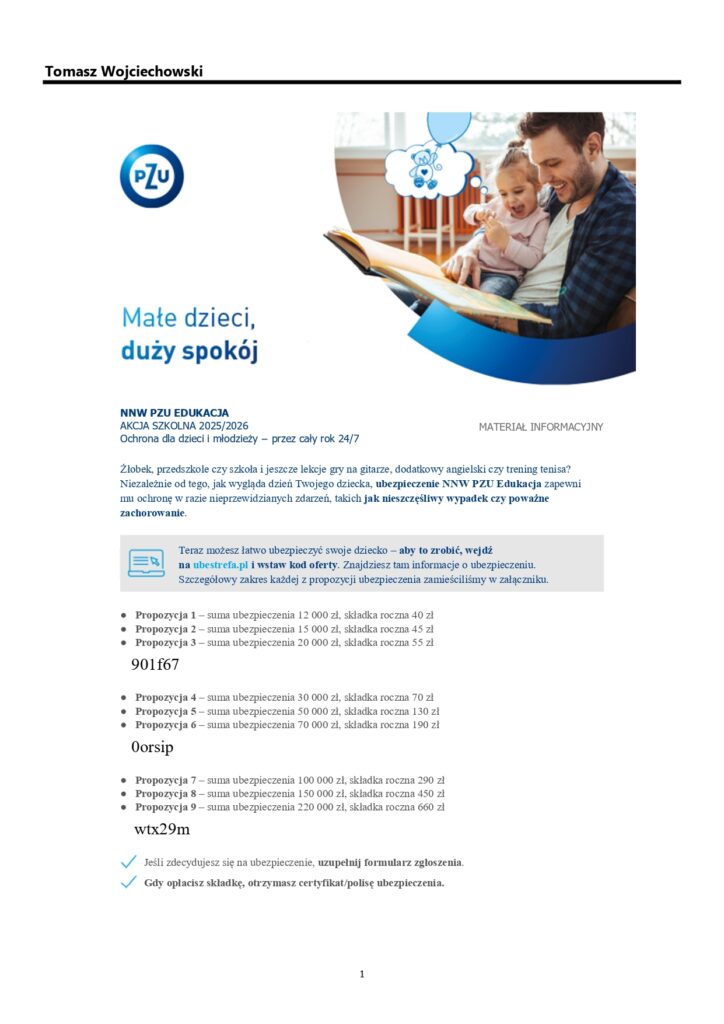 Zachęcamy Państwa do ubezpieczenia swojego dziecka już teraz w PZU. Będzie ono obowiązywało od 1 września 2025 do 31 sierpnia 2026.